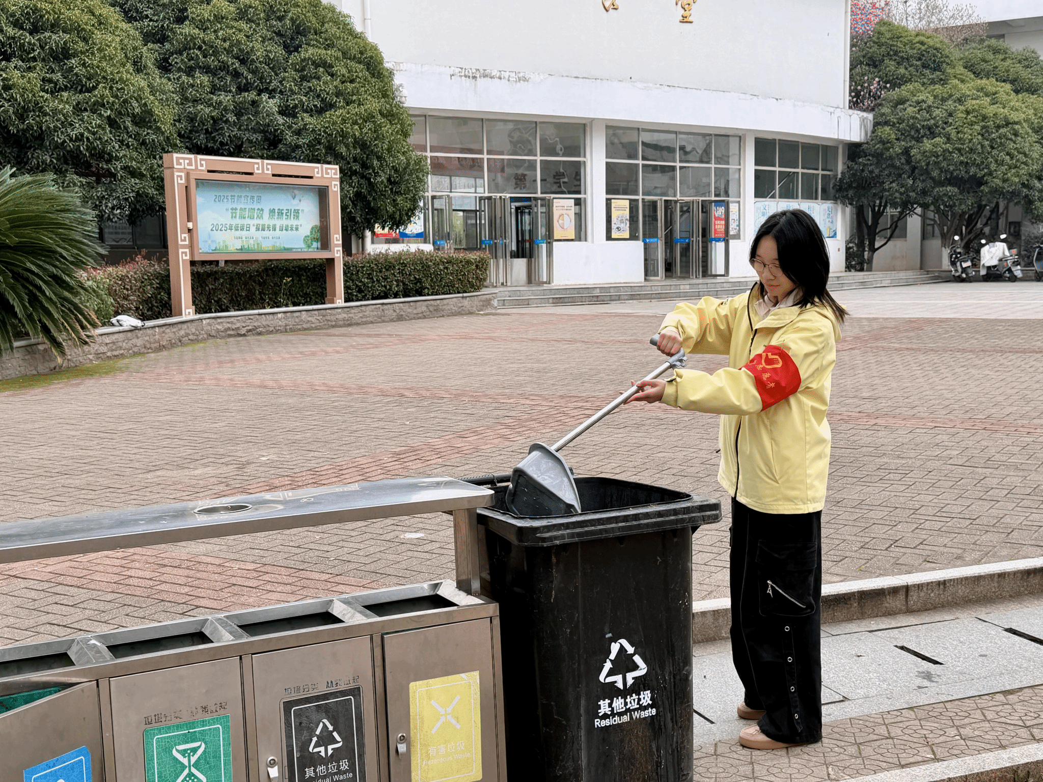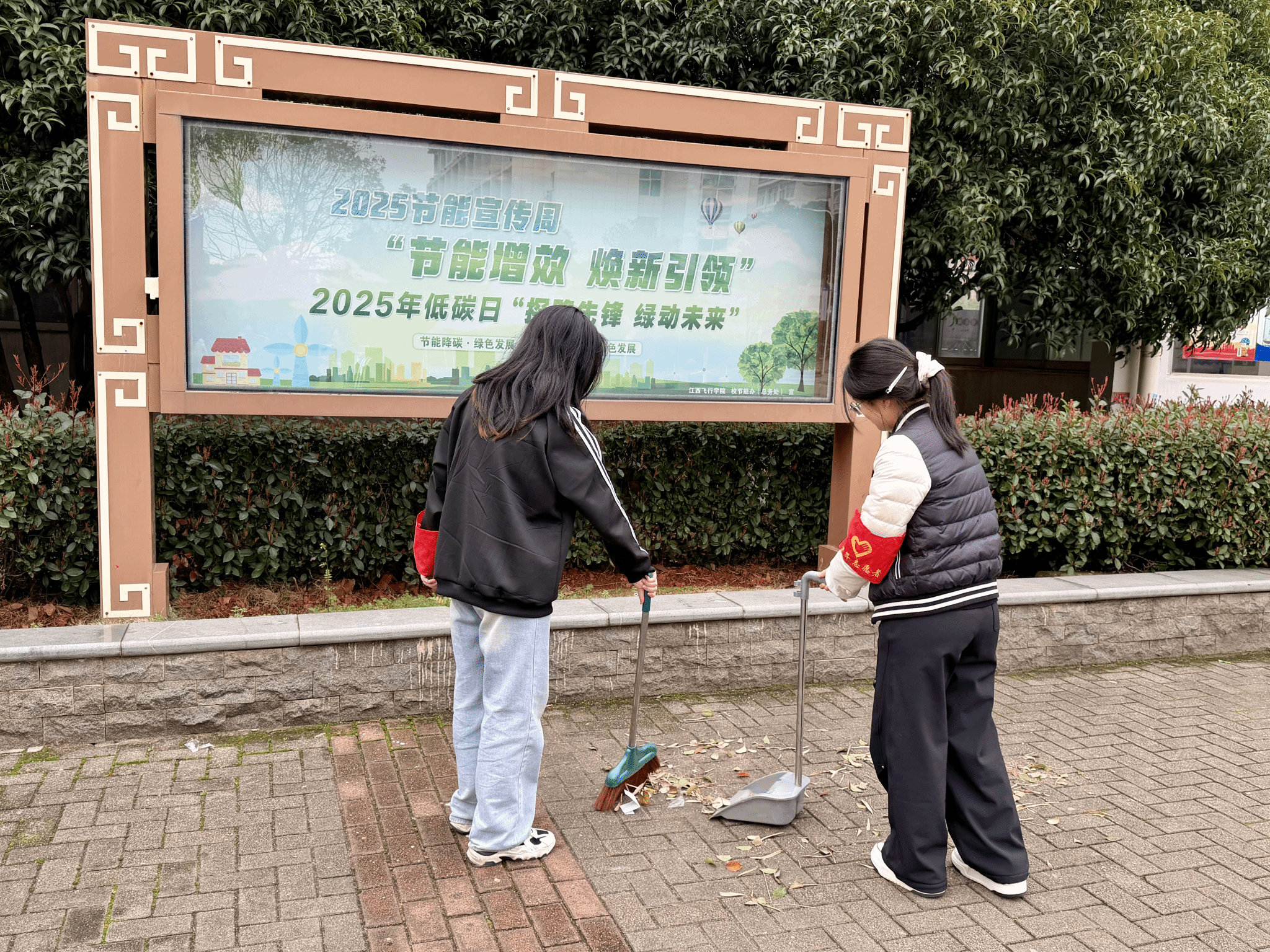 与此同时,校园的各个角落都能看到佩戴鲜红志愿者袖章的同学们,他们在进行简单的分工之后,迅速投入到热火朝天的劳动中。教学楼外,佩戴着“志愿者”袖章的同学们手持簸箕、扫帚等工具,认真清扫着着学校的每一处角落,大家不放过一片纸屑,劳动虽琐碎,但志愿者们的脸上始终洋溢着热情的笑容。他们分工协作,配合默契,不怕脏、不怕累,有的清扫地面,有的倾倒垃圾,整个校园处处洋溢着青春蓬勃的气息。同学们表示,“在雷锋日参加这样的活动非常有意义,我们要用实际行动告诉同学们,雷锋精神不是一句口号,而是要从身边的小事做起。”