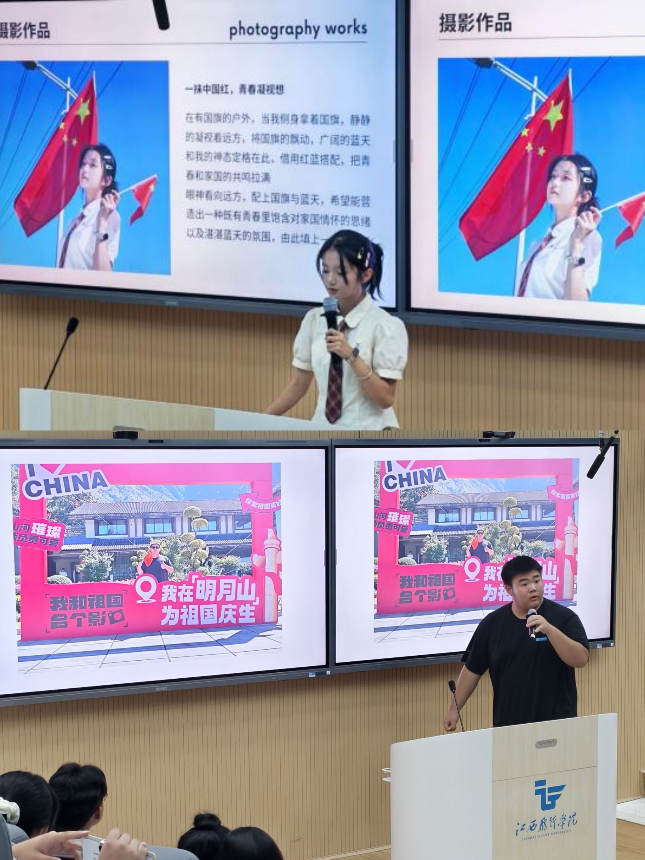 决赛环节以“作品呈现 + PPT 理念阐释”为核心形式展开,选手们借助逻辑清晰、画面生动的PPT,将一个个多元鲜活的“家国瞬间”娓娓道来:既有聚焦城市地标今昔变迁的细腻画面,用镜头直观呈现祖国数十年来日新月异的繁荣发展成就;也有走进红色革命旧址的纪实影像,以庄重的镜头语言致敬先辈们无私奉献的伟大精神;更有将浓厚爱国情怀融入校园日常生活、家庭团圆时刻的温馨片段,让宏大的家国情感变得具体可感、真实亲切,引发在场观众的强烈共鸣。