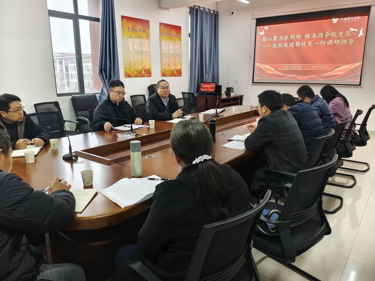 2026 年 1 月 26 日 下午,校党委委员、副校长郭军华赴经济与管理学院调研学院科研工作,学院领导班子、科研处相关领导及部分科研骨干参会。